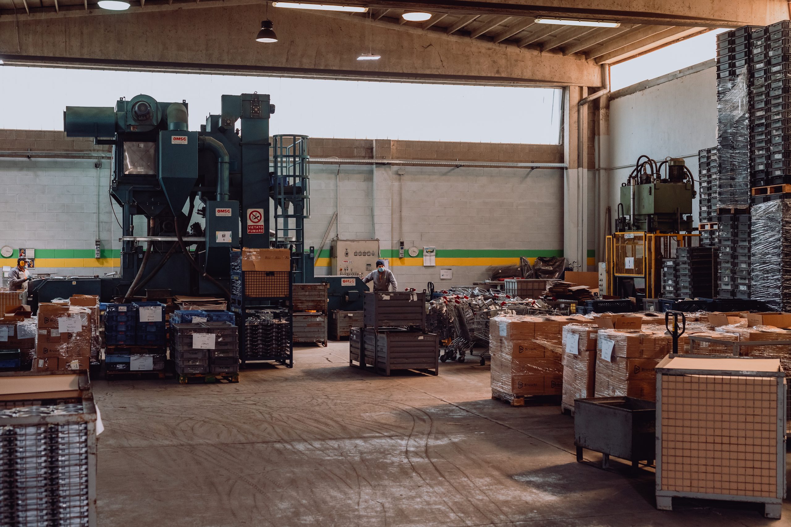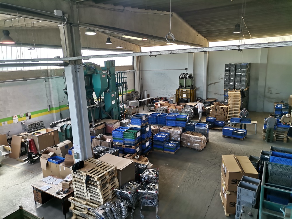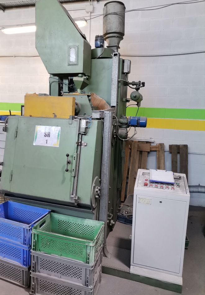 - 1 sabbiatrice a tunnel (OMSG) con tappeto lungo 7 mt, 4 turbine (2 inferiori e 2 superiori), inverter di potenza e velocità di trascinamento della rete di lavoro e impiego di cilindretti di accio inox Ø 0,4 mm.